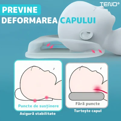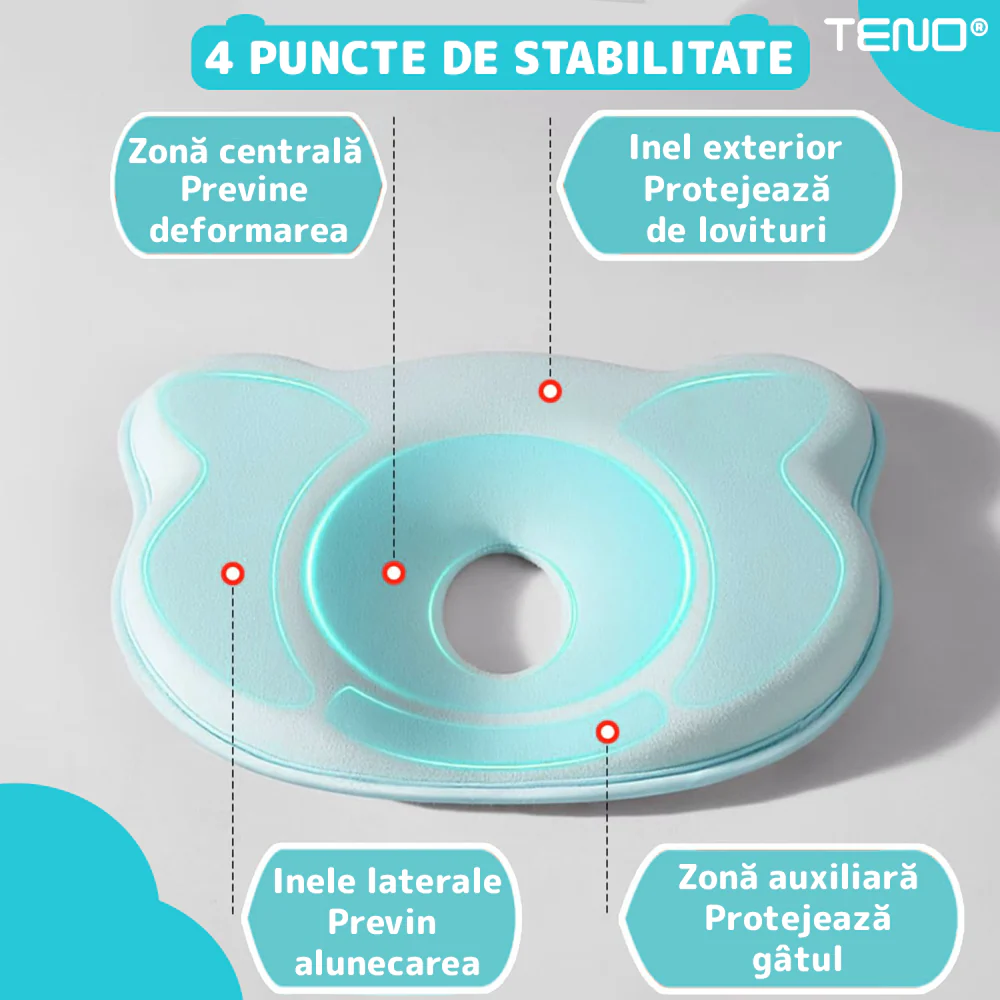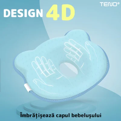 Perna este concepută special pentru a ajuta la prevenirea și corectarea turtirii capului (plagiocefalia), o problemă comună în primele luni de viață. Designul său ergonomic și forma specială a pernei ajută la distribuirea uniformă a presiunii asupra capului, sprijinind astfel o dezvoltare naturală și sănătoasă.