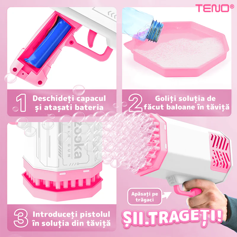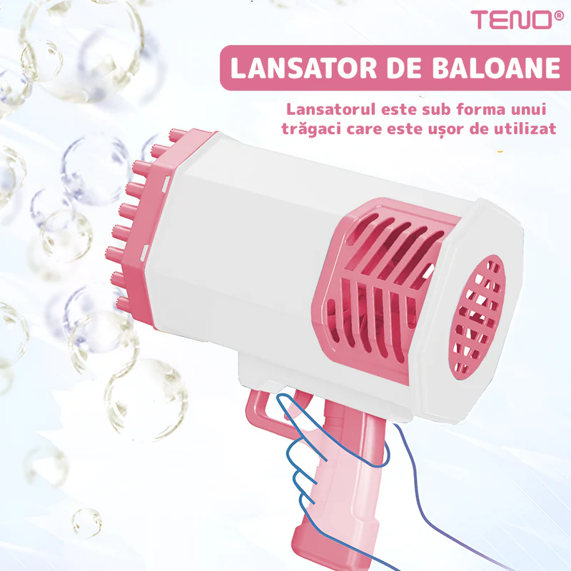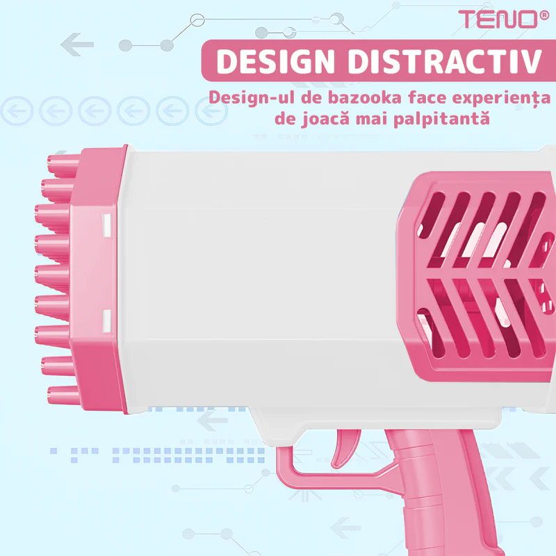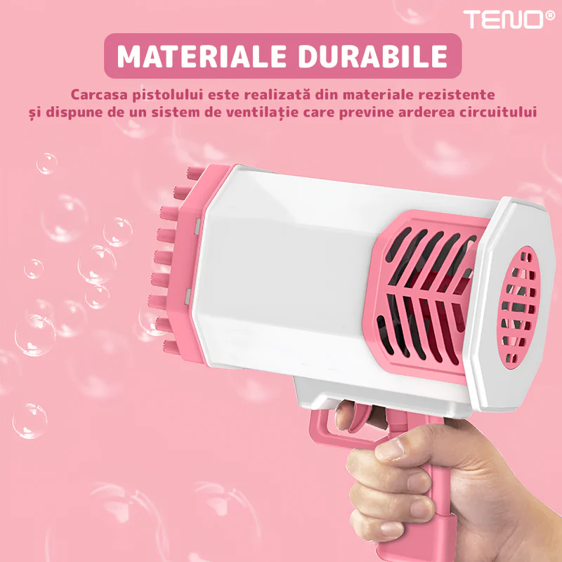 Pistolul de facut baloane Bubble Gun este o jucărie distractivă și interactivă, perfectă pentru a crea momente de bucurie atât pentru copii, cât și pentru adulți. Cu un design inovator și funcționalități interesante, acest pistol cu bule promite ore întregi de distracție în aer liber.