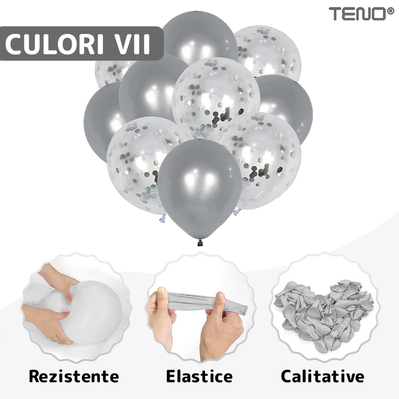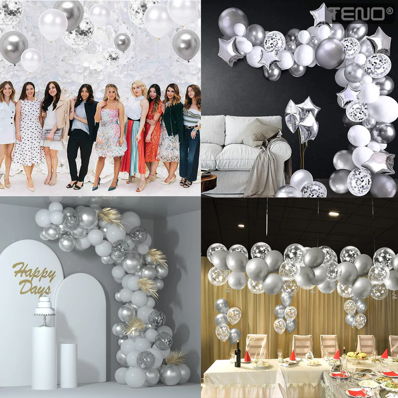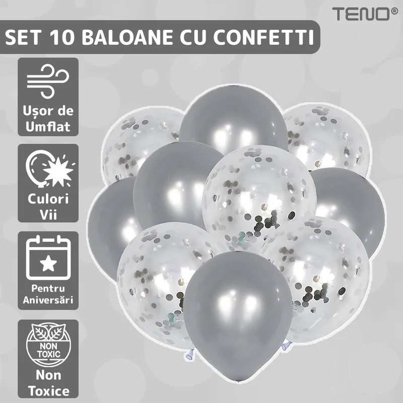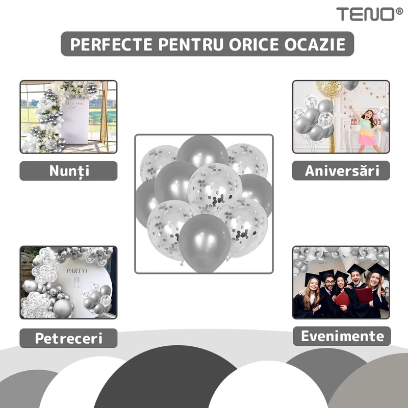 - Design modern: Baloanele argintii cu confetti adaugă un aer sofisticat și contemporan oricărui decor.