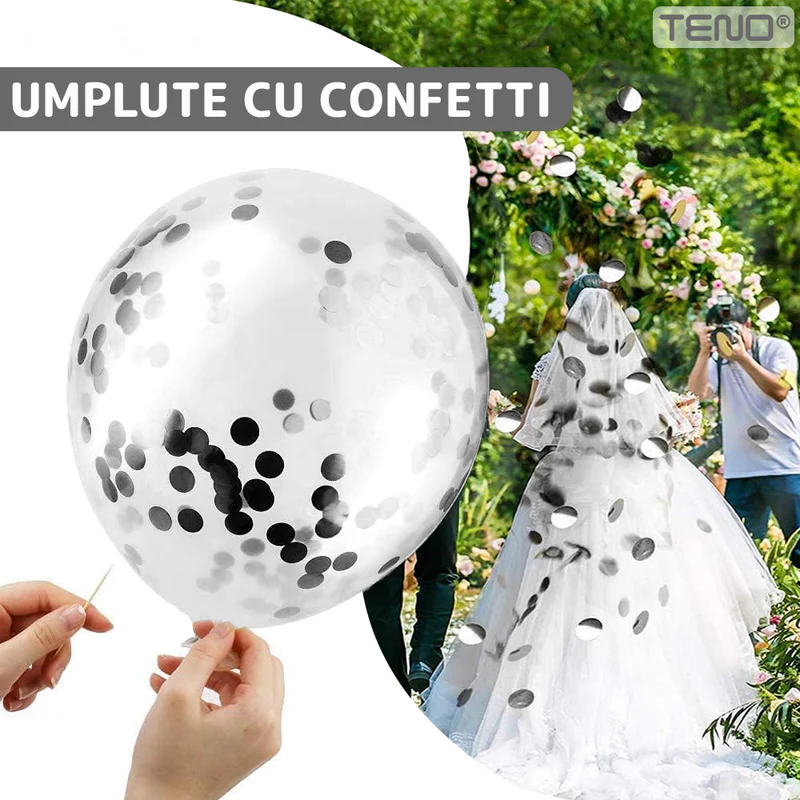 - Confetti strălucitor: Confettiul inclus în interiorul baloanelor adaugă un plus de strălucire și creează un efect spectaculos atunci când baloanele sunt umflate.