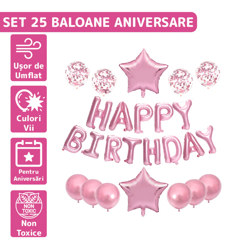 Setul de 27 de baloane “Happy Birthday” este soluția perfectă pentru a crea o atmosferă festivă și memorabilă la orice petrecere de aniversare. Cu un design elegant și culori vibrante, acest set va transforma orice eveniment într-o sărbătoare de neuitat.