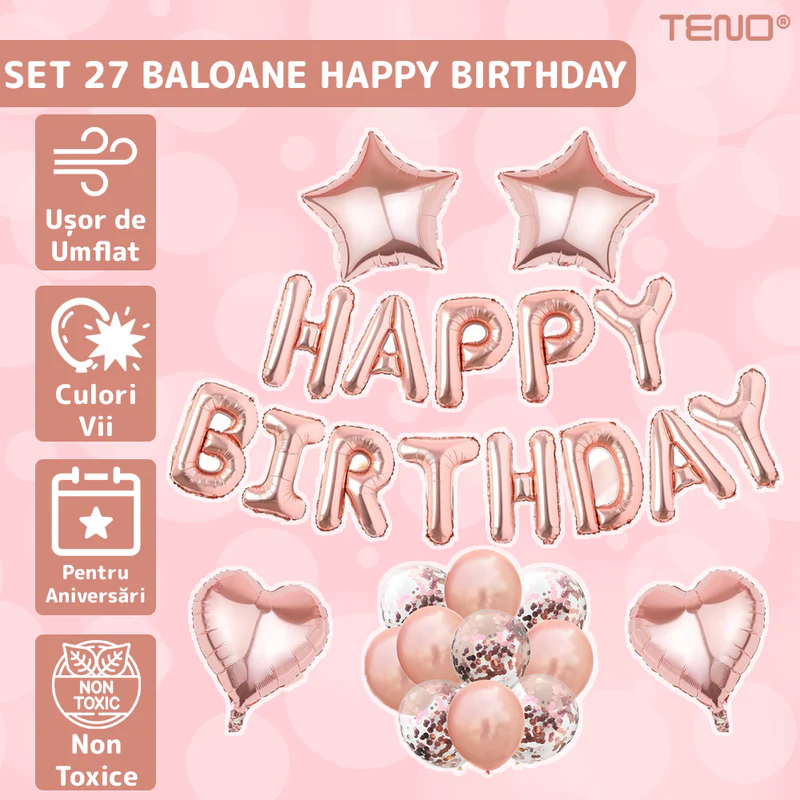 Setul de 27 de baloane “Happy Birthday” este soluția perfectă pentru a crea o atmosferă festivă și memorabilă la orice petrecere de aniversare. Cu un design elegant și culori vibrante, acest set va transforma orice eveniment într-o sărbătoare de neuitat.