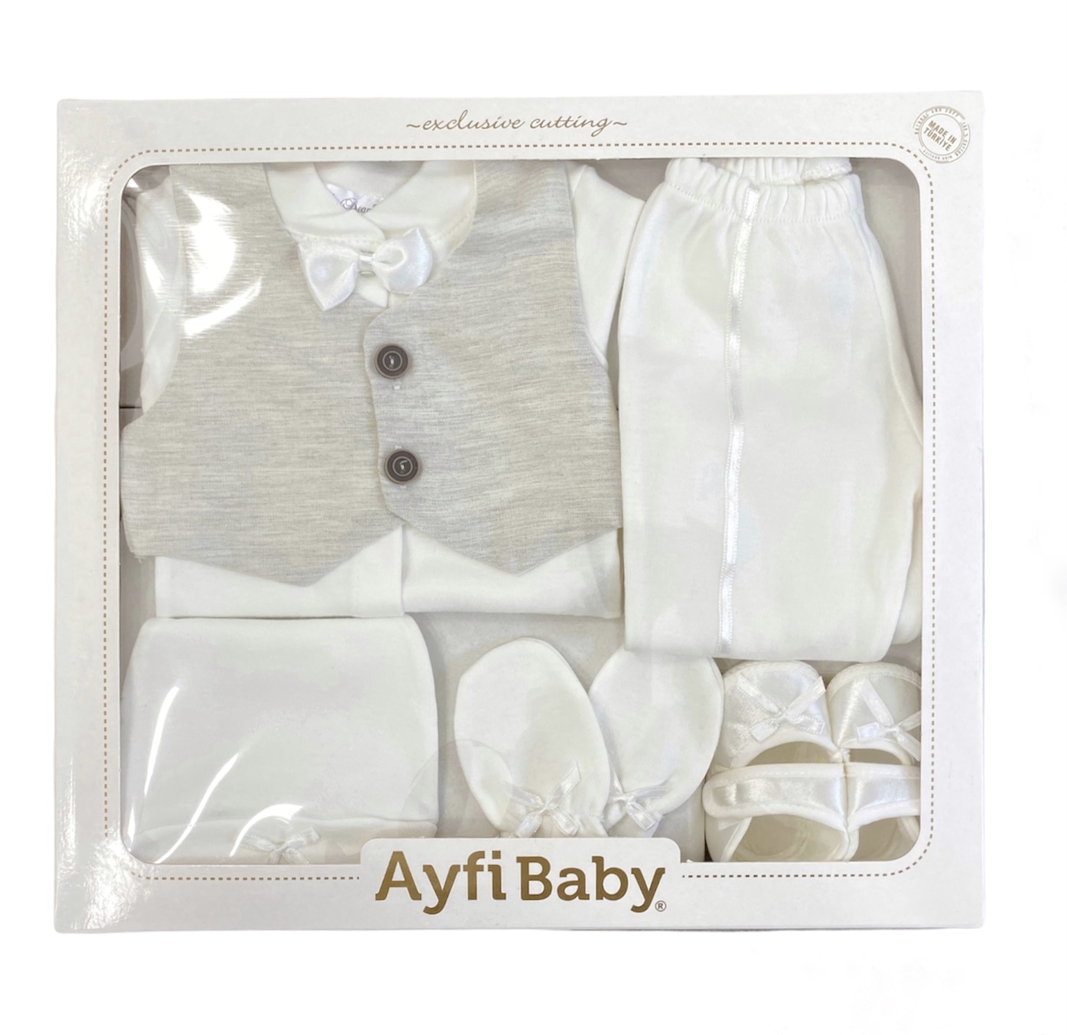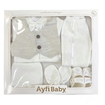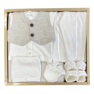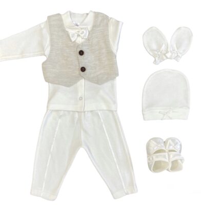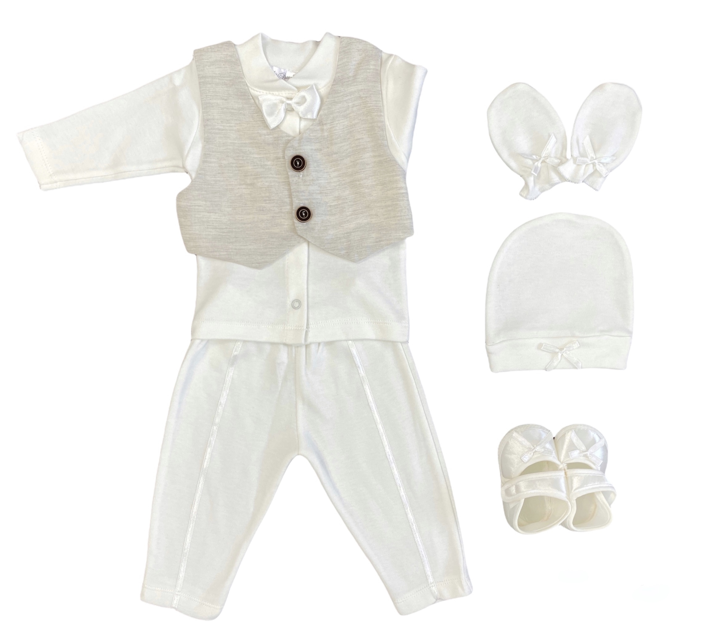 Varsta:0-3 luniSet nou nascut din 5 piese : bluza de corp alba cu vesta si papion, manusi, botosei, caciulita, pantaloni