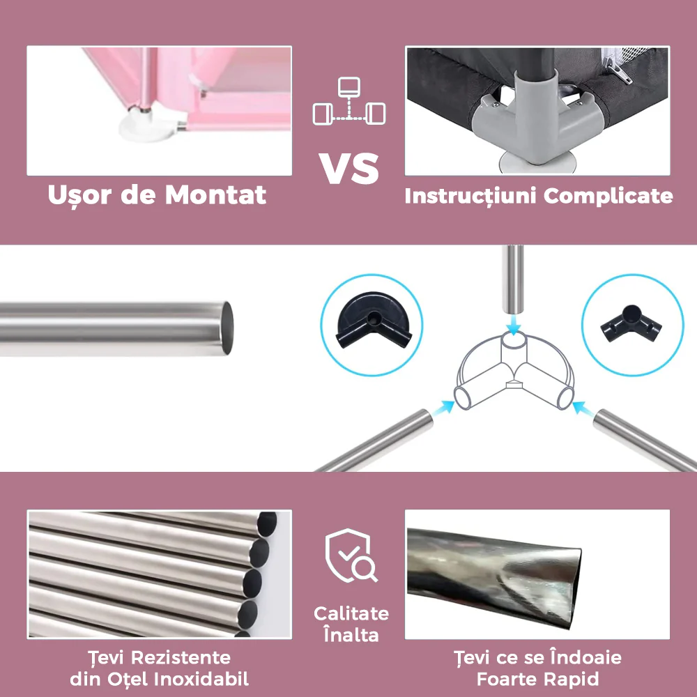 - Ușor de montat și demontat – Se montează rapid, fără a necesita unelte speciale, iar demontarea este la fel de simplă, făcându-l ideal pentru utilizare acasă sau în călătorii.