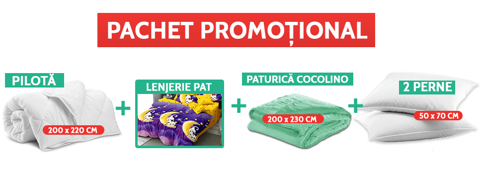 Ai pachet promoțional format din lenjerie cu 6 piese, 2 perne și o pilotă, toate la preț avantajos. Accesează secțiunea cu pachete promoționale și descoperă modelele de lenjerii din bumbac pe care le poți alege. Află ofertele TrendyHome la articole textile pentru pat.